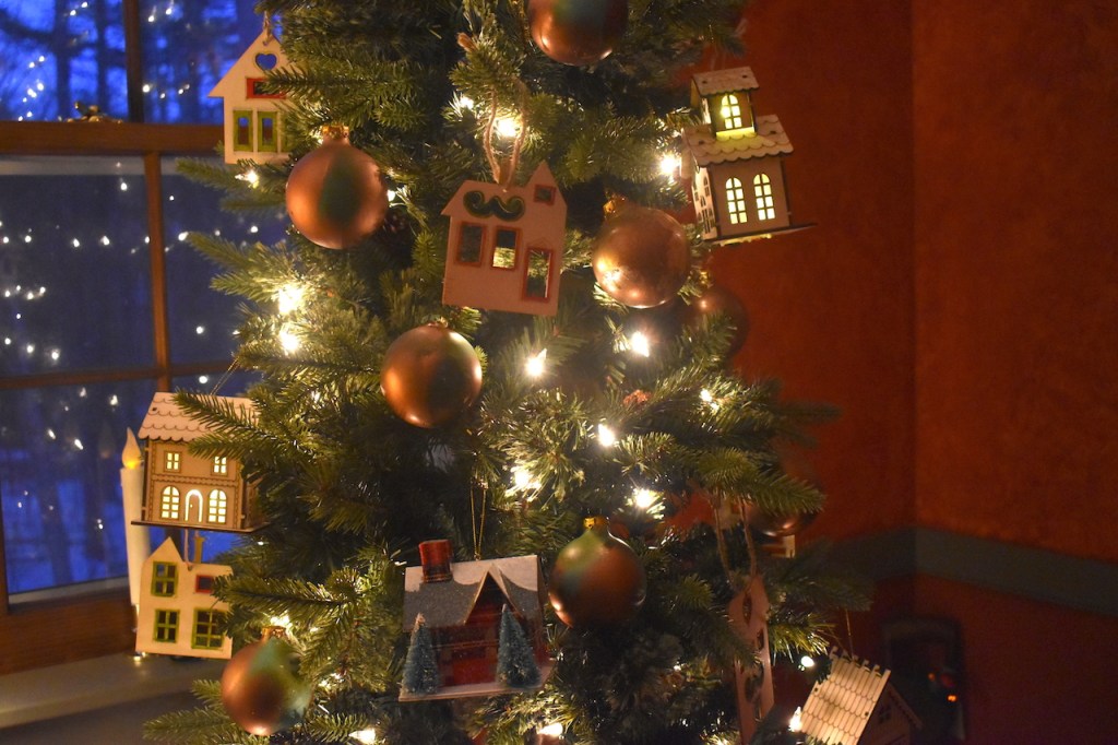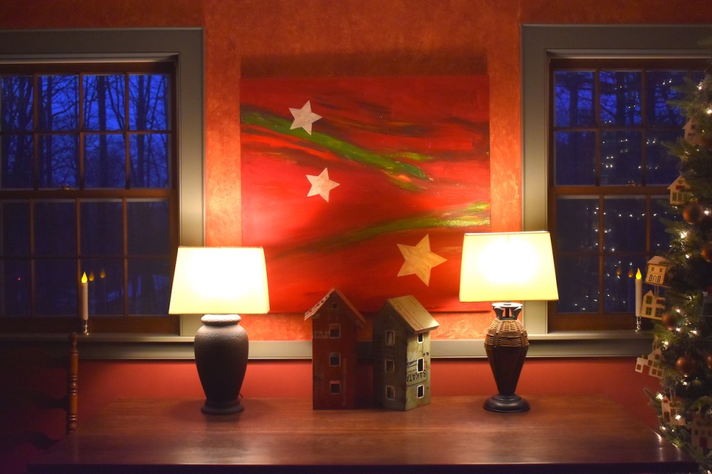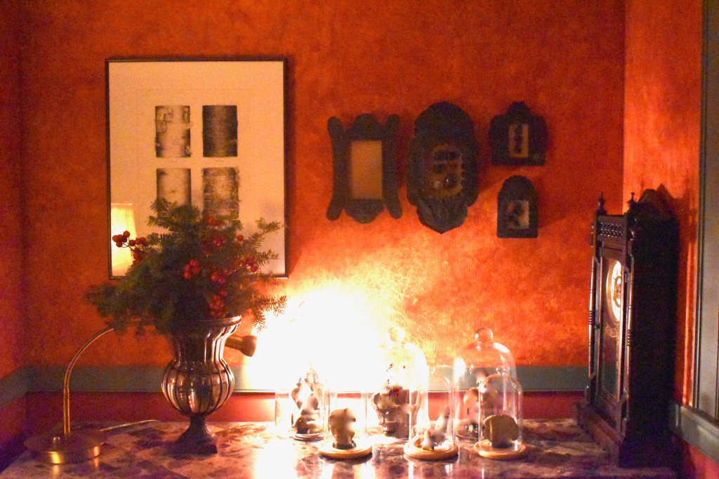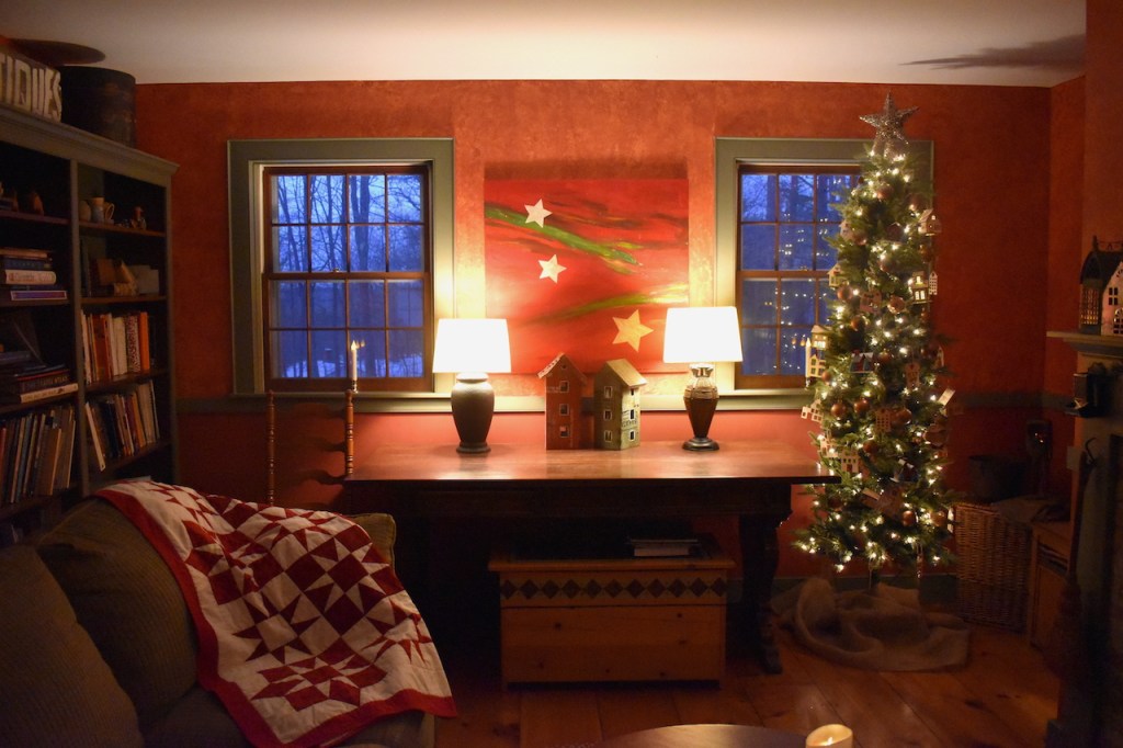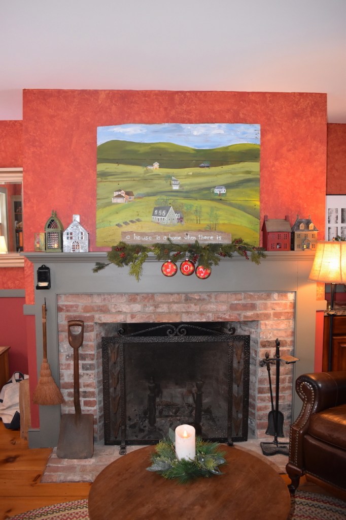 This whole arrangement, tho simple, is a collection of home memories. The fireplace screen and tools were my grandparents in their home (I can still envision it all these 60 years later), the table was theirs too, the old snow shovel circa 1900 was from David’s family that he uses for fireplace ashes, the houses are part of a collection that David and I have created. He sold houses at one point and we have remodeled a few…hmmmm, a theme here.I painted this on floor boards from our 1900’s home we remodeled in Concord, NH. (See the series here) The imagery is of the different homes David and I have lived in together, including, at the top back, the 2 we each grew up in, only blocks apart meeting many years later. Center front is this home where the painting hangs.To the left of the fireplace is our library table with bookshelves lining the left hand wall. Home is where there are books.. A painting I did years ago comes out each Christmas and this year more houses decorate the table and the tree holds many representations of homes.I hand painted details on to wooden cut-outs of houses.My daughter and I made these ornaments many years ago in that further most left-hand house in the picture. Get a bucket of water and randomly spray spray-paint over the top of the water. Quickly dip in those clear glass bulbs you get at a craft store–the paint clings to them like marbling–then hang them to dry. We used gold, copper, moss green and pale turquoise to give them an aged copper look.A hutch tucked into a corner of the room holds more memories; family collectibles under cloches, framed memories from a trip to Mexico and my grandfathers clock. Simple live greens make the room smell good! Thank you to a friend who gives me bunches each year. And a shout out to artist J. Ann Eldridge, print maker, for the birch tree print on the wall that gives us endless joy.