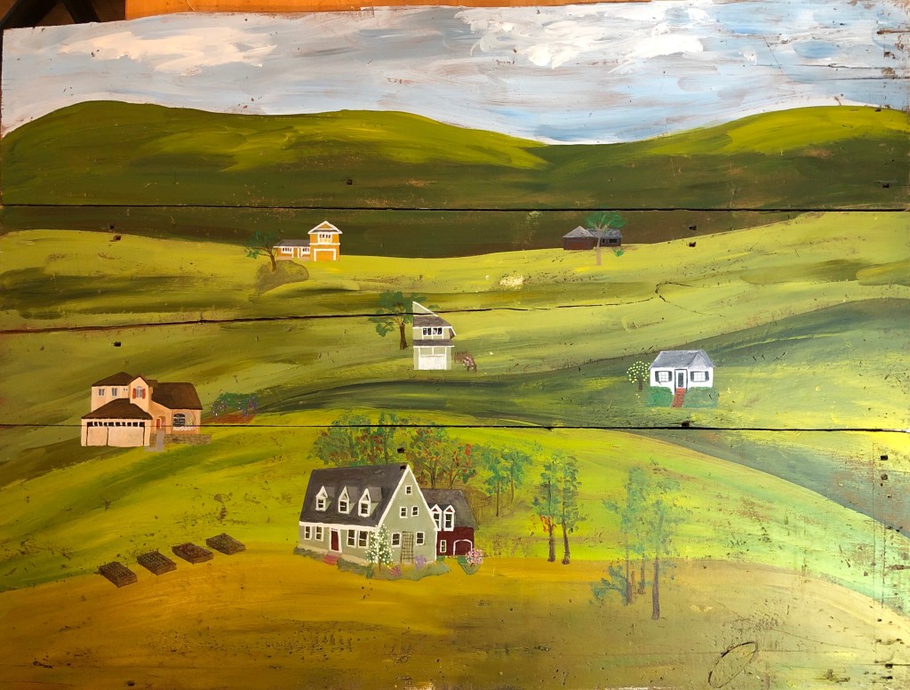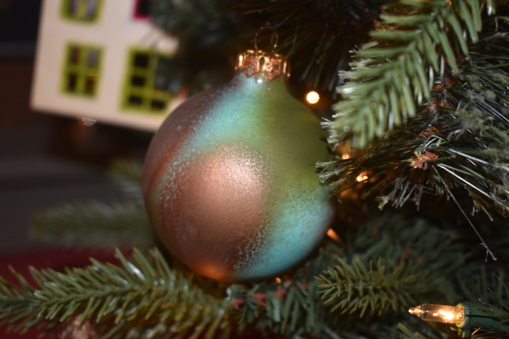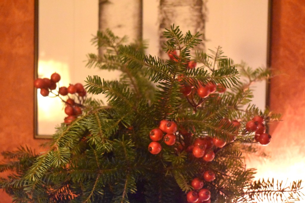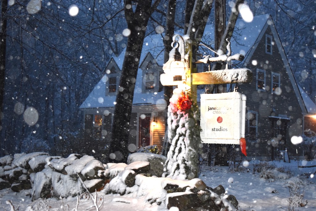 This whole arrangement, tho simple, is a collection of home memories. The fireplace screen and tools were my grandparents in their home (I can still envision it all these 60 years later), the table was theirs too, the old snow shovel circa 1900 was from David’s family that he uses for fireplace ashes, the houses are part of a collection that David and I have created. He sold houses at one point and we have remodeled a few…hmmmm, a theme here.I painted this on floor boards from our 1900’s home we remodeled in Concord, NH. (See the series here) The imagery is of the different homes David and I have lived in together, including, at the top back, the 2 we each grew up in, only blocks apart meeting many years later. Center front is this home where the painting hangs.To the left of the fireplace is our library table with bookshelves lining the left hand wall. Home is where there are books.. A painting I did years ago comes out each Christmas and this year more houses decorate the table and the tree holds many representations of homes.I hand painted details on to wooden cut-outs of houses.My daughter and I made these ornaments many years ago in that further most left-hand house in the picture. Get a bucket of water and randomly spray spray-paint over the top of the water. Quickly dip in those clear glass bulbs you get at a craft store–the paint clings to them like marbling–then hang them to dry. We used gold, copper, moss green and pale turquoise to give them an aged copper look.A hutch tucked into a corner of the room holds more memories; family collectibles under cloches, framed memories from a trip to Mexico and my grandfathers clock. Simple live greens make the room smell good! Thank you to a friend who gives me bunches each year. And a shout out to artist J. Ann Eldridge, print maker, for the birch tree print on the wall that gives us endless joy.