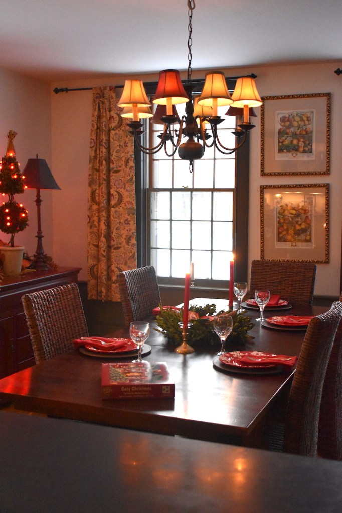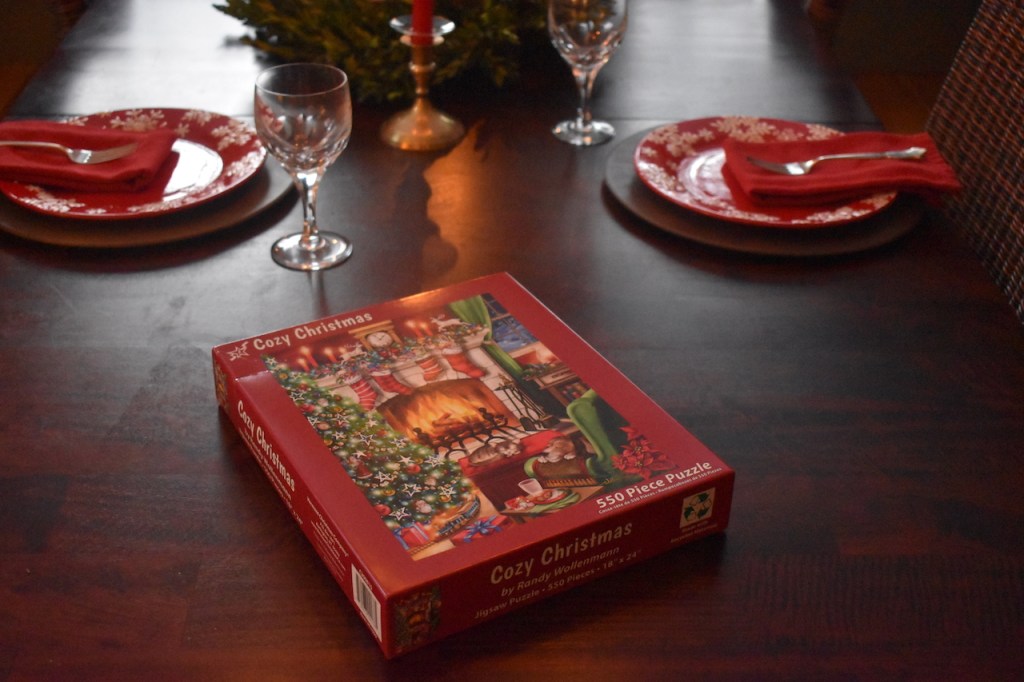 I purchased a boxwood wreath early in the season so, now dried, it has become a table decoration. A sentimental basket holds sentimental childhood ornaments to look at while seated.My grandmothers sideboard painted with a deep red always looks good with Christmas greens. I added topiary to the arrangement this year.A straw angel given to me when I was a child tops the topiary.Puzzle ready for a nice long week-end.