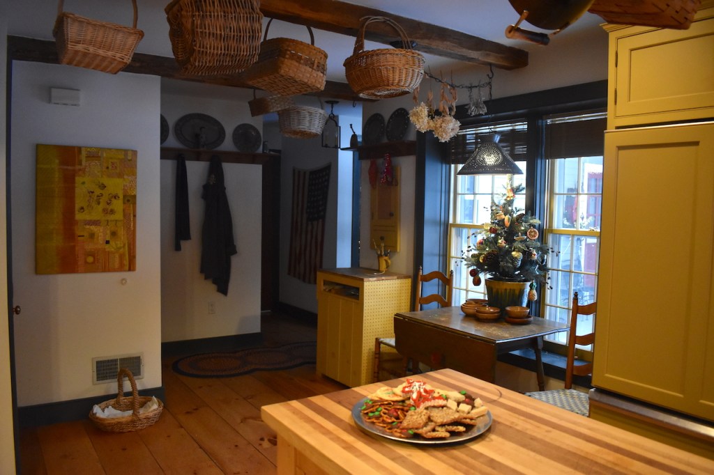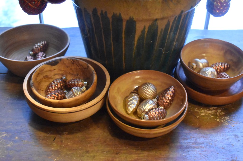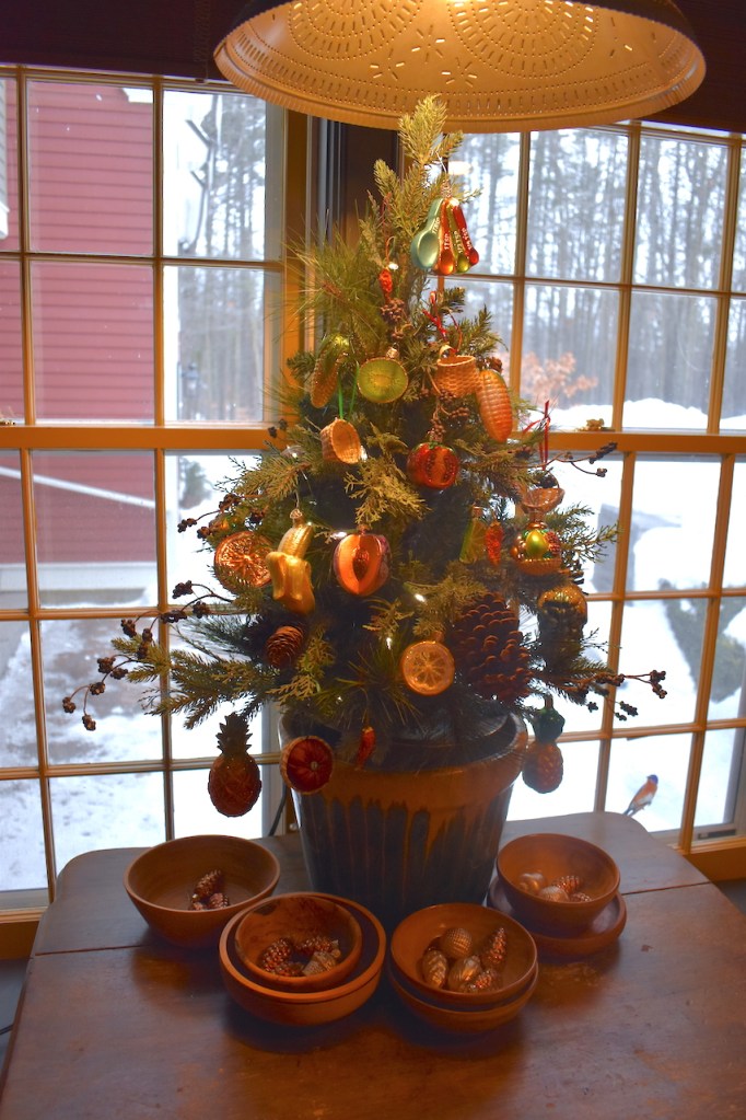 In our New England home, we enter from the back door and immediately we are in the kitchen. All my harvest baskets hang ready for a trip to the garden, herbs and flowers dry in the rafters and LOTS of good stuff get produced in here. This year I just put up a little tree on the gathering table, a table my grandfather hand painted when my mom and her sis were wee girls.I always use the turned wood and pottery bowls that David made to decorate with; this year, filled with ornaments.I have quite a collection of fruit and vegetable ornaments and this year I also dried the last of the tiny-almost-full-grown peppers from the end of the season to hang on the tree.Mini baskets that mimic my larger harvest baskets also dec the tree. This collection of baskets have been given to me by a dear friend, made by the New Hampshire artist Sharon Dugan.The tree is topped with a nod to one of my favorite past times here.Christmas 2020 fun!
