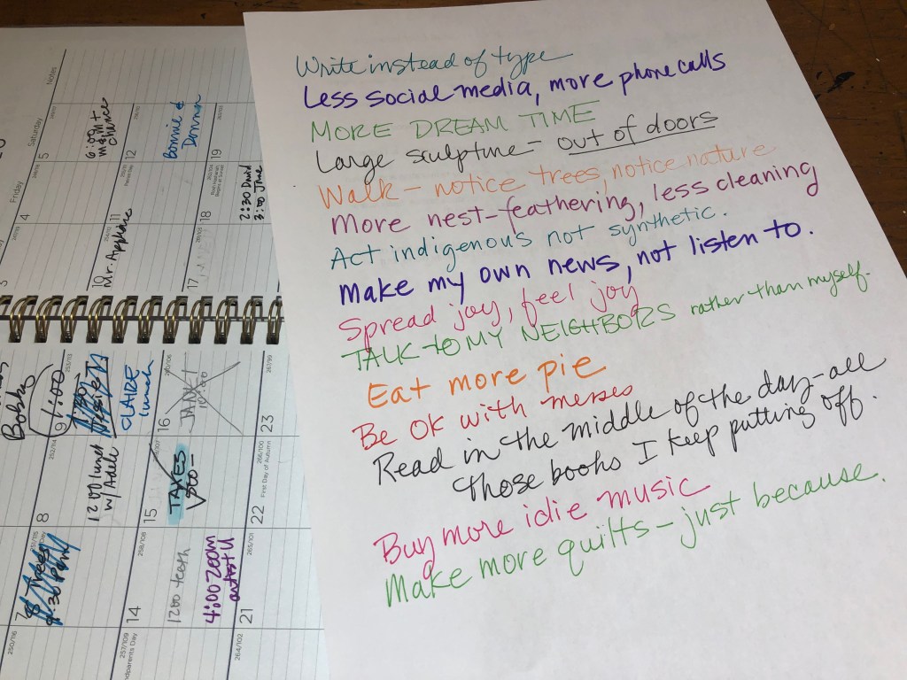 I have written about this before—so have others—of the importance to focus on our internal attitude and to set our intentions rather than focussing on the resulting outcome. We have learned from this past year that goal setting may be futile with so many unexpected changes around us but we can intend to be more joyful or more flexible or more creative which in turn helps the unexpected yield new possibilities.