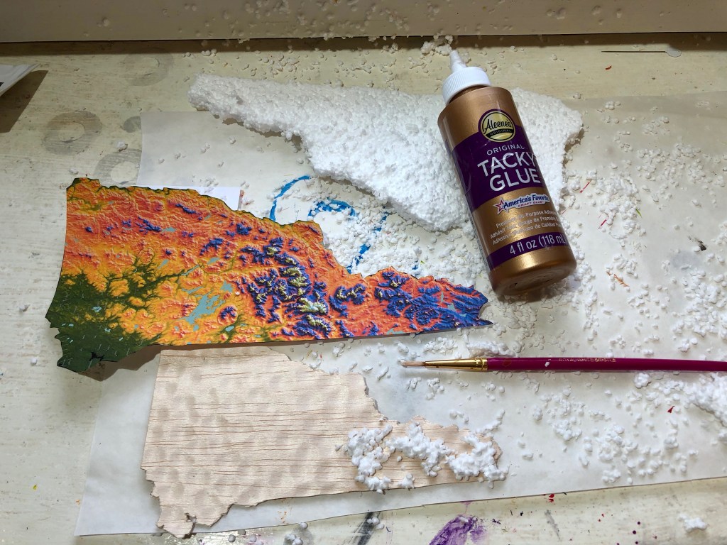 Inspired by the relief map of the state, I used those crumbled, messy bits of foam mixed with tacky glue to create the some mountains on my balsa cutout. I then color matched the Beacon Hill Damask and painted the balsa then touched with foam parts white to represent snow.