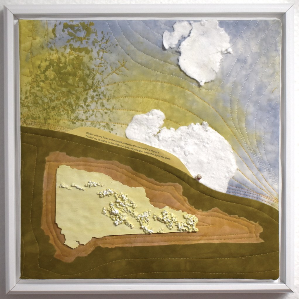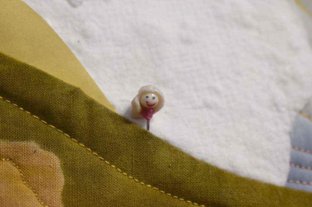 So I had the ideas to continue….I made some cotton & wool rag paper dispersed with more bits of that foam to resemble clouds, printed my verse onto paper colored with that Damask, made a polymer head of myself on a pin then assembled it. Check.