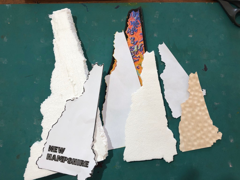 I first grabbed some images of the state off the internet then sized them in PAGES, printed then cut them each out as a template. I first experimented with cutting out different types of foam–what a crumbly mess–and ended up simply cutting out some balsa. This allowed me to use the hammered element.