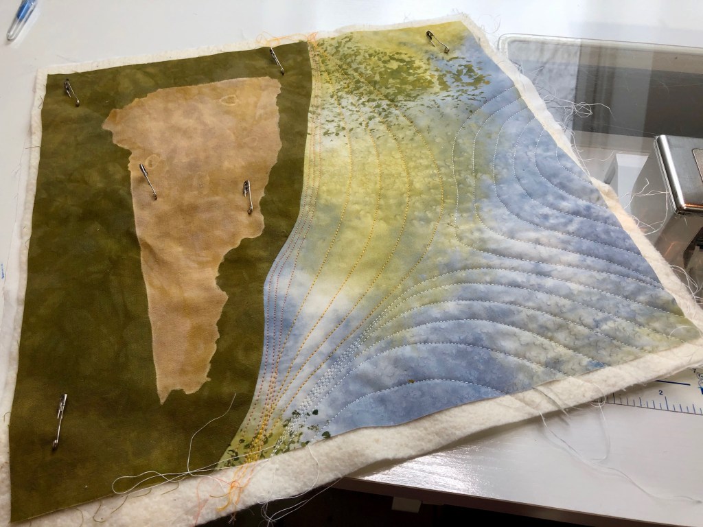 It then started coming together. Ah ha, I thought, the shape of the state is a bit like a mountain range. I went to my bin of hand-painted fabrics and pulled out this that looked like sky and also had that damask color in it. Score.