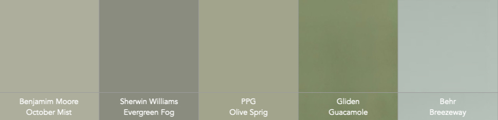 For picking a green for a room color or craft project DON’T look at the greens on the paint palette (or straight off the color wheel), but instead look at the grays or browns that have a ‘green tint’ to them.  In large amounts those muted tones will read green.