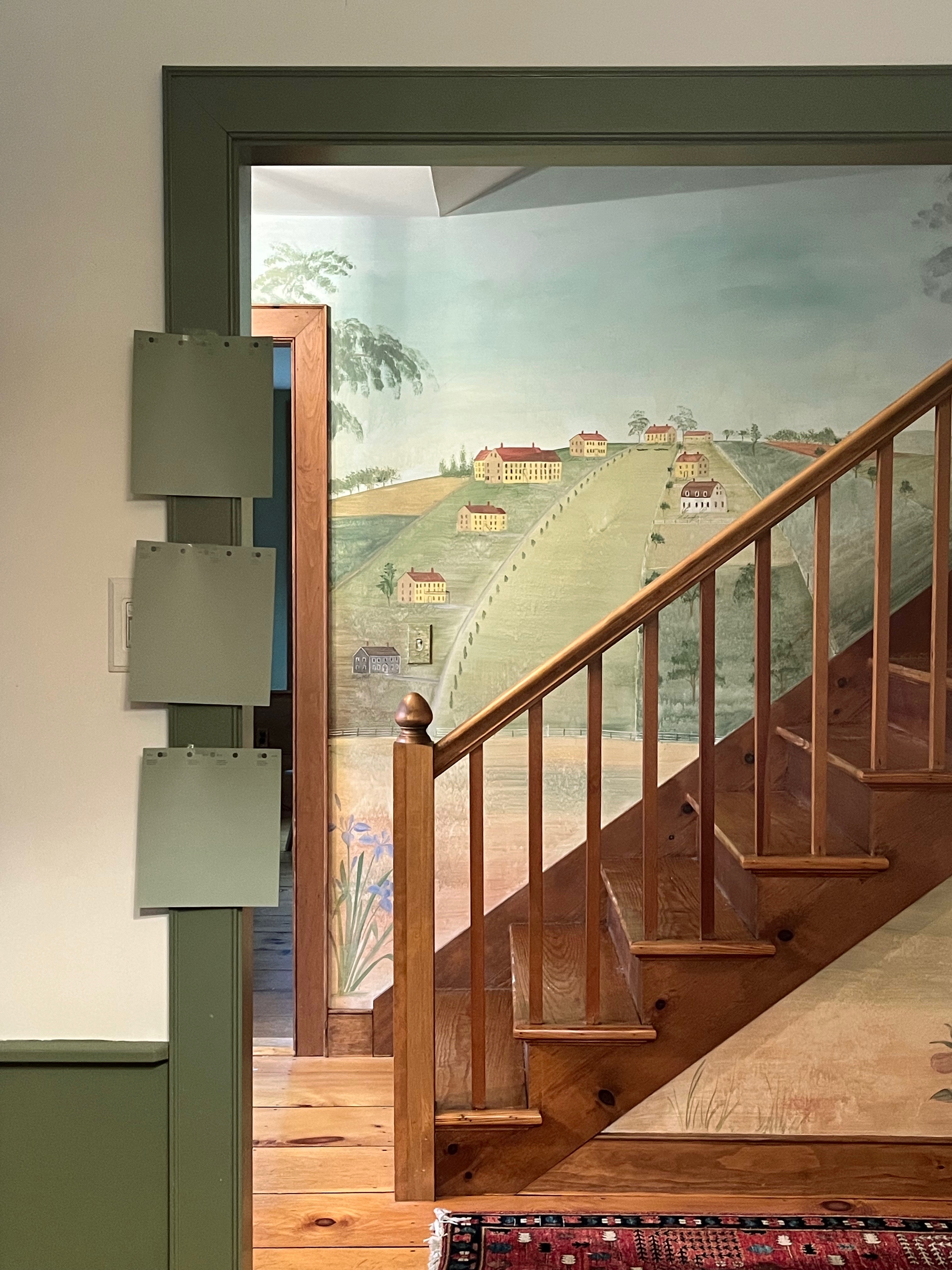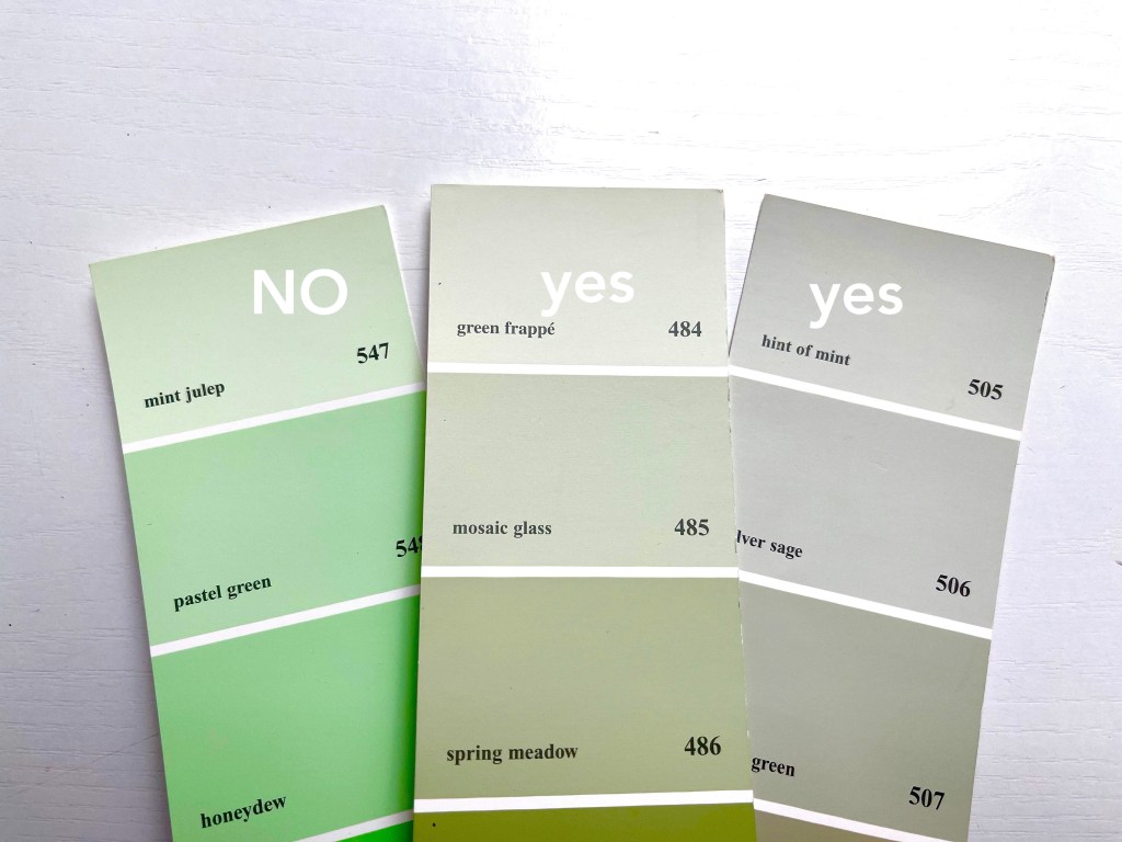 Know that when any paint color as it lightens gets cooler and more stark.  This is due to the presence of titanium dioxide, calcium dioxide or other fillers that help make the paint opaque.  Those fillers have a gray cast to them so when you reduce the green pigment the gray takes over. This means you may need to jump to a different shade of green if you don’t want a pale shade to lose all its warmth and look like mint ice cream, a sometimes depressive color to live with.
