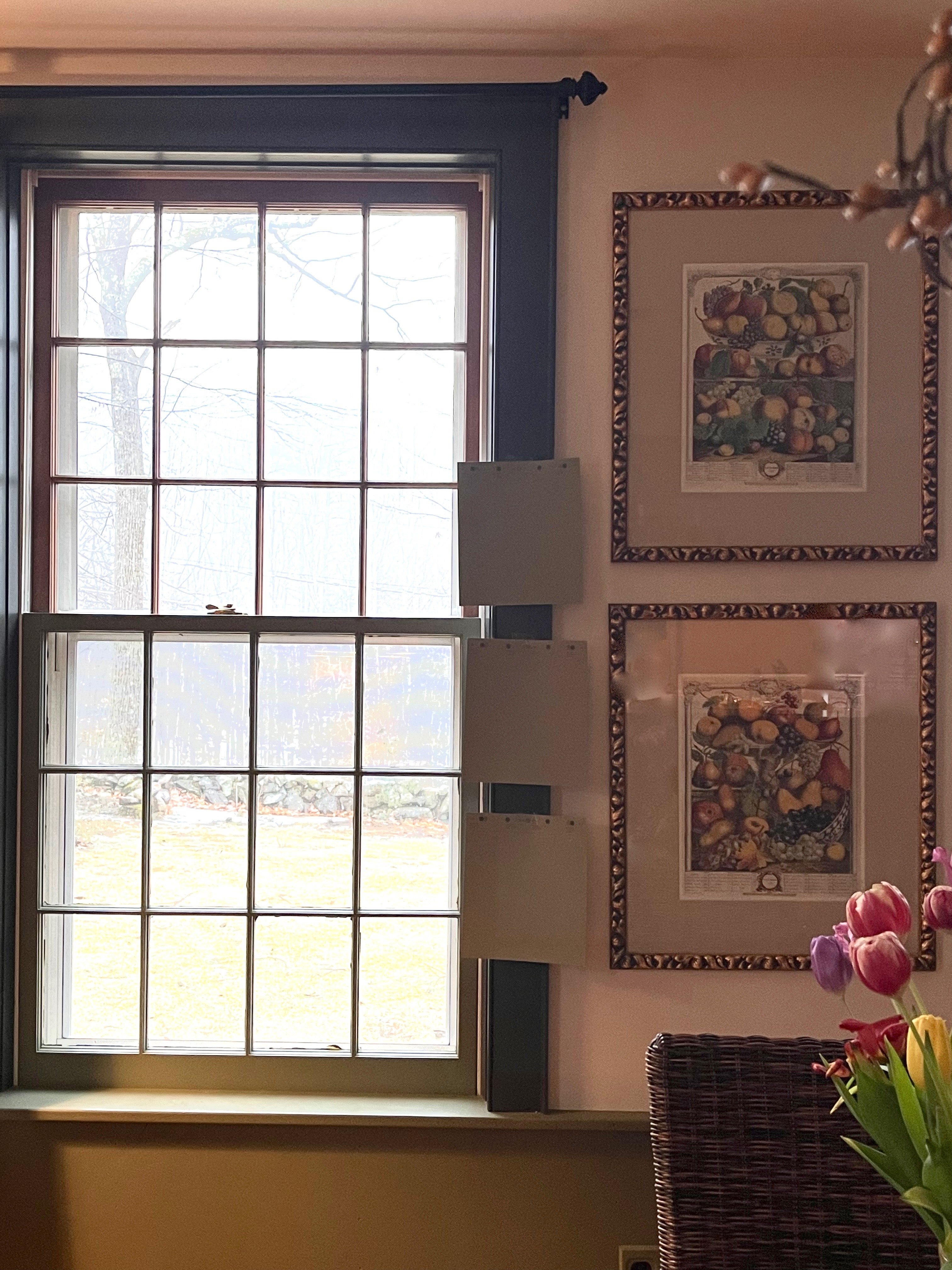 I am planning to repaint the trim in my kitchen and dining room this spring.  It has been a darker gray-green that we loved but I am lightening it a bit to give the room a refreshed look.  I have chosen several gray greens and am currently auditioning them in the room, hanging the swatches in different lights and checking them out as the day light progresses and wanes.  All are good I think.  What do you think?