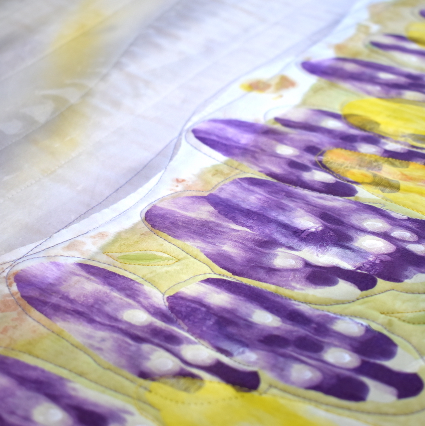 Even within the paint style categories not all paint is the same. Just like some cheaper house paints will not glide on evenly and take multiple coats to cover, some fabric paints can be gummy and drag on the cloth. This can be OK for stippling, for example, but not OK for creating a blurred and blended image. Some paints will hold up to constant wear due to fillers in the paint and some will lend themselves to invisibility on the cloth giving it a soft & fluid hand. And besides the feel of the paint, some cheaper paints use pigments that are not lightfast. For my work, I alternate between a dozen or so different types of paints—all professional grade— to achieve the desired, long-lasting effect on the cloth.