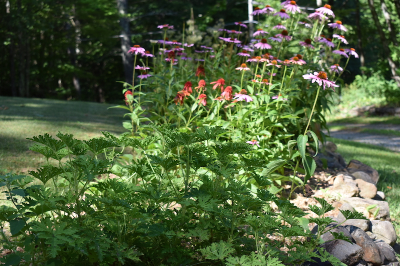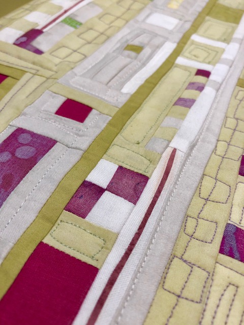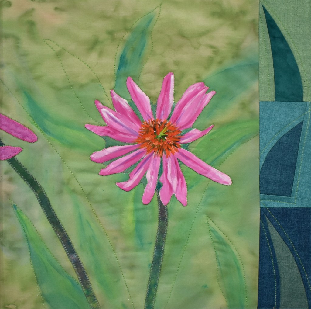 While this little painted and appliquéd quilt features a literal echinacea bloom, the piecing to the right was inspired by what I saw in the shadows of the herb bed.
