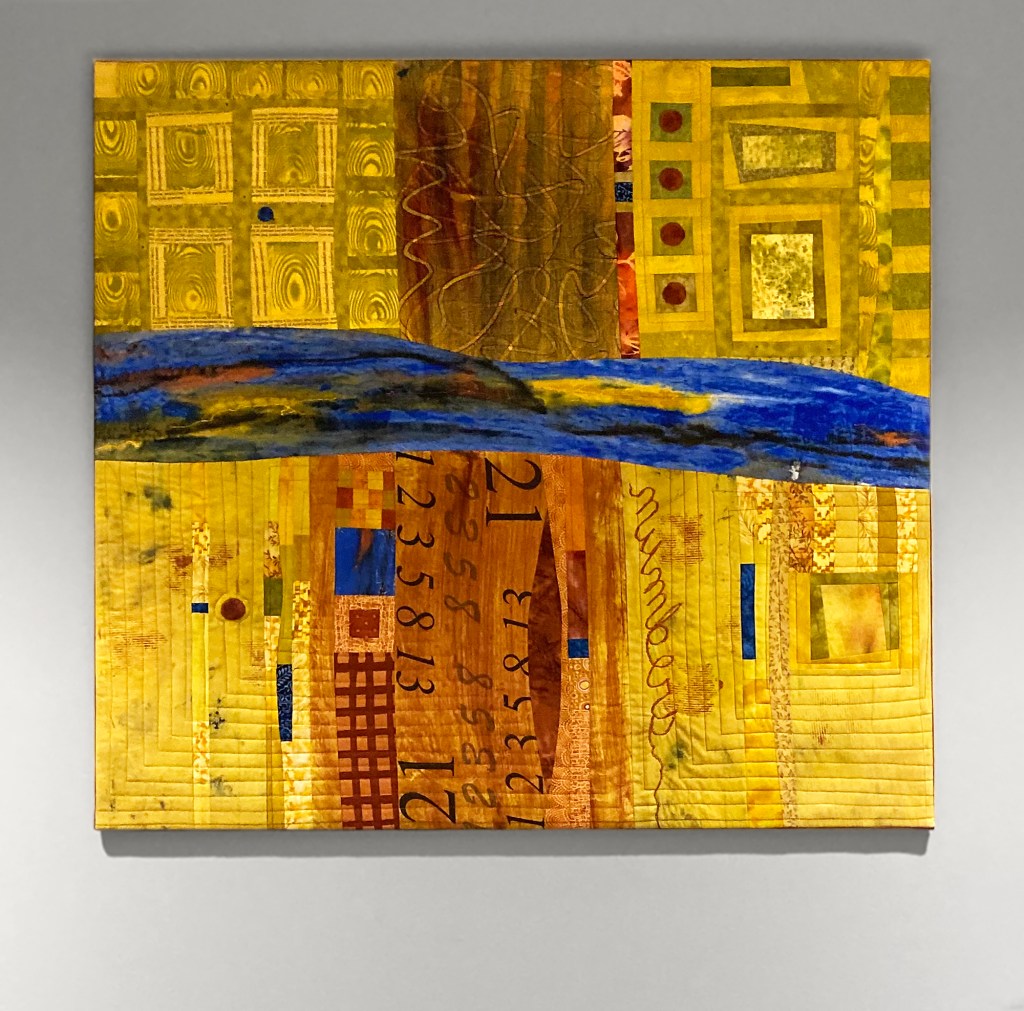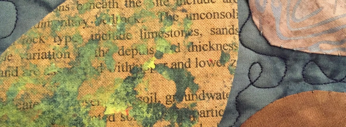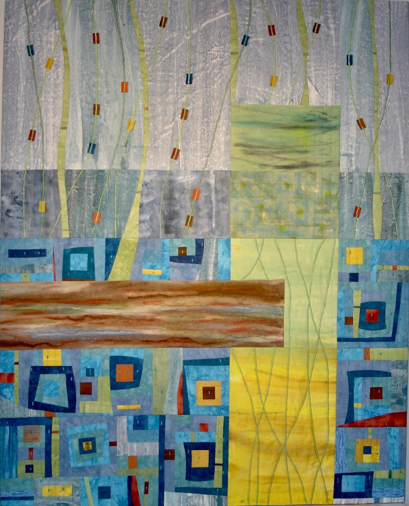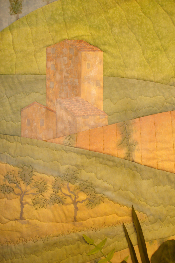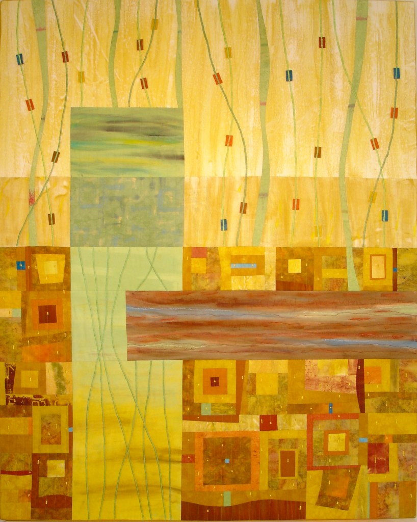 This piece was commissioned by the accounting firm Baker Newman Noyes of Manchester, NH. Hand painted and printed cotton with thread embellishment. Inquire about commissioned work.This very large stretched wall quilt was commissioned by a client who wanted to depict the view out of her window through the field into the woods. As a biologist, she also wanted to represent the various flora, fauna and critters who reside there. There are 80 types printed onto fabric then stitched into other hand-painted fabrics to produce an over-all abstracted scene. Inquire about commissioned work.This was commissioned to fill a cathedral wall above a fireplace in an expanded tuscan-style living room. As a nod to the client’s Italian heritage, the fabric was painted and sculpted in the style of an Italian Renaissance landscape still-life. Inquire about commissioned work.This trio was commissioned by Frisbee Memorial Hospital in Rochester, NH. The design was dictated by the interior decorator & was simply reflective of the selected color scheme and upholstery fabrics. Inquire about commissioned work.