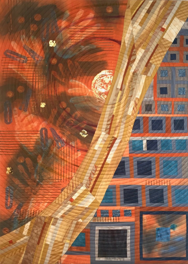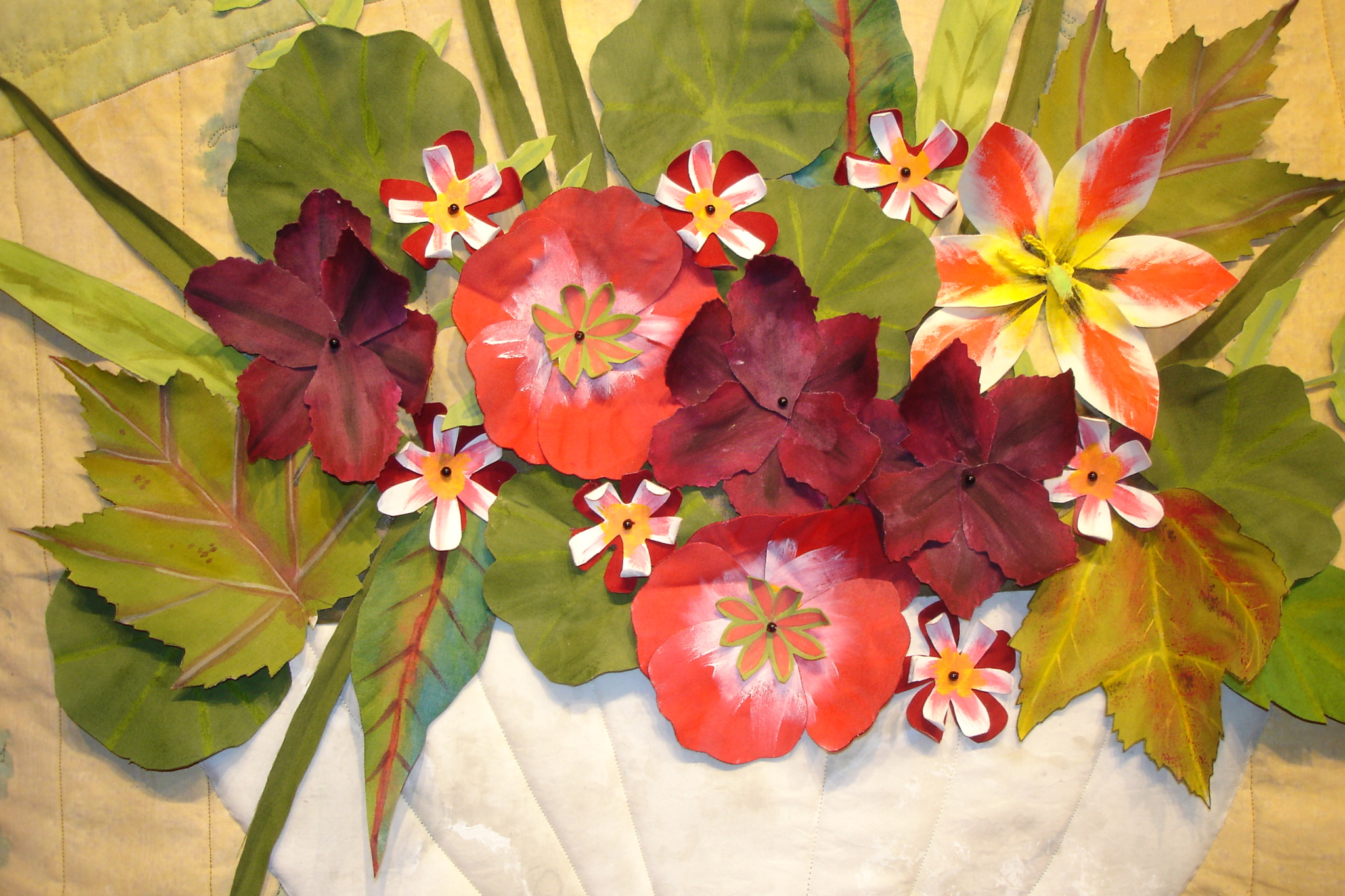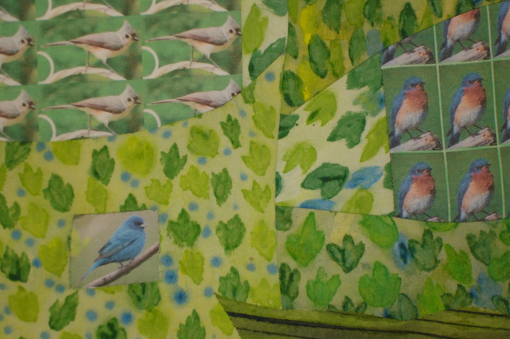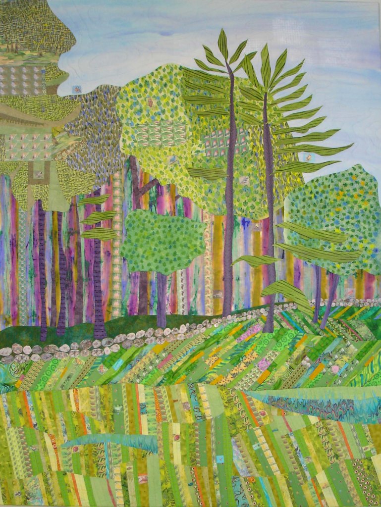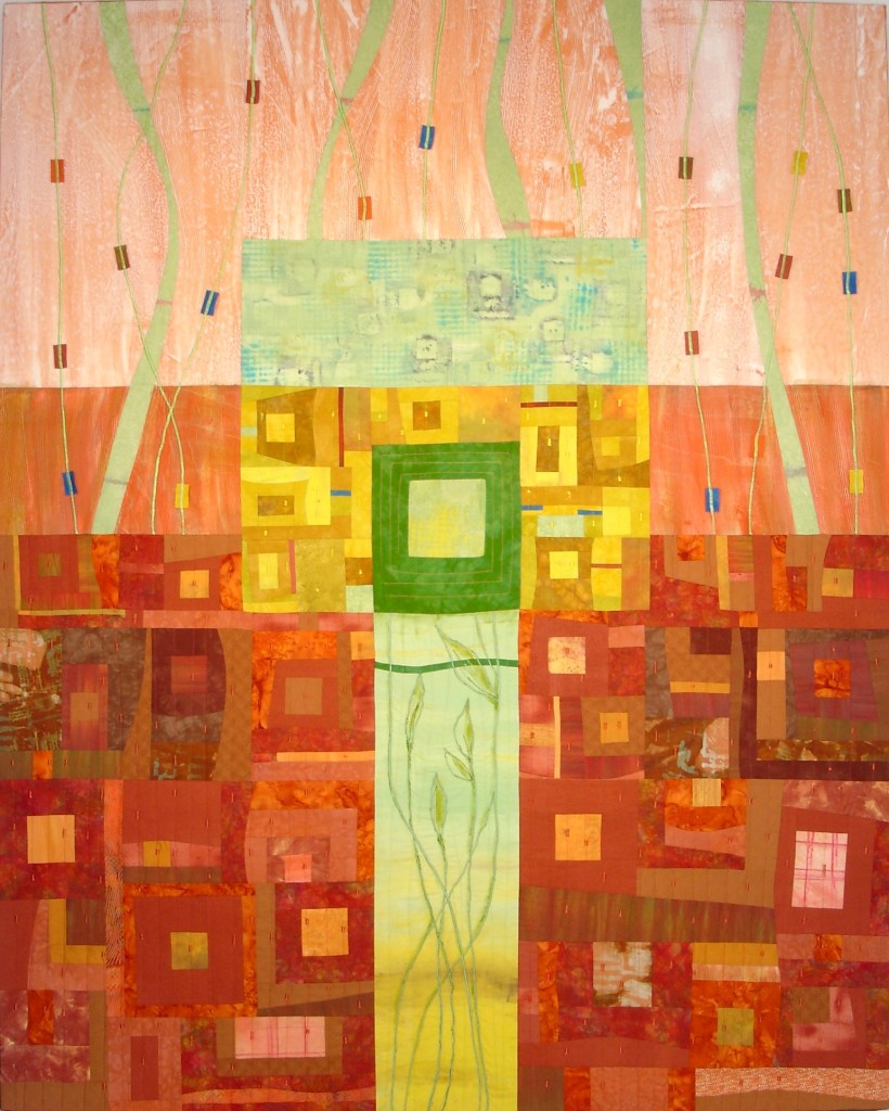 This piece was commissioned by the accounting firm Baker Newman Noyes of Manchester, NH. Hand painted and printed cotton with thread embellishment. Inquire about commissioned work.This very large stretched wall quilt was commissioned by a client who wanted to depict the view out of her window through the field into the woods. As a biologist, she also wanted to represent the various flora, fauna and critters who reside there. There are 80 types printed onto fabric then stitched into other hand-painted fabrics to produce an over-all abstracted scene. Inquire about commissioned work.This was commissioned to fill a cathedral wall above a fireplace in an expanded tuscan-style living room. As a nod to the client’s Italian heritage, the fabric was painted and sculpted in the style of an Italian Renaissance landscape still-life. Inquire about commissioned work.This trio was commissioned by Frisbee Memorial Hospital in Rochester, NH. The design was dictated by the interior decorator & was simply reflective of the selected color scheme and upholstery fabrics. Inquire about commissioned work.